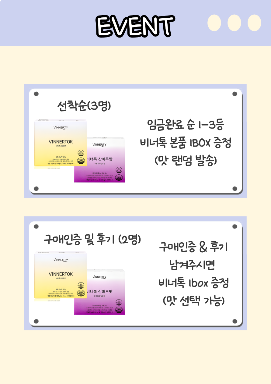2) 구매인증 및 후기 이벤트 2명 : 비너톡 맛 선택 1박스 증정